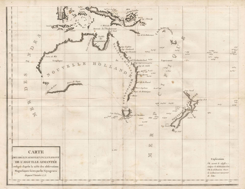 This map holds important value as one of the earliest thematic charts dedicated to geomagnetism in Australasia, predating systematic surveys by Matthew Flinders and others.