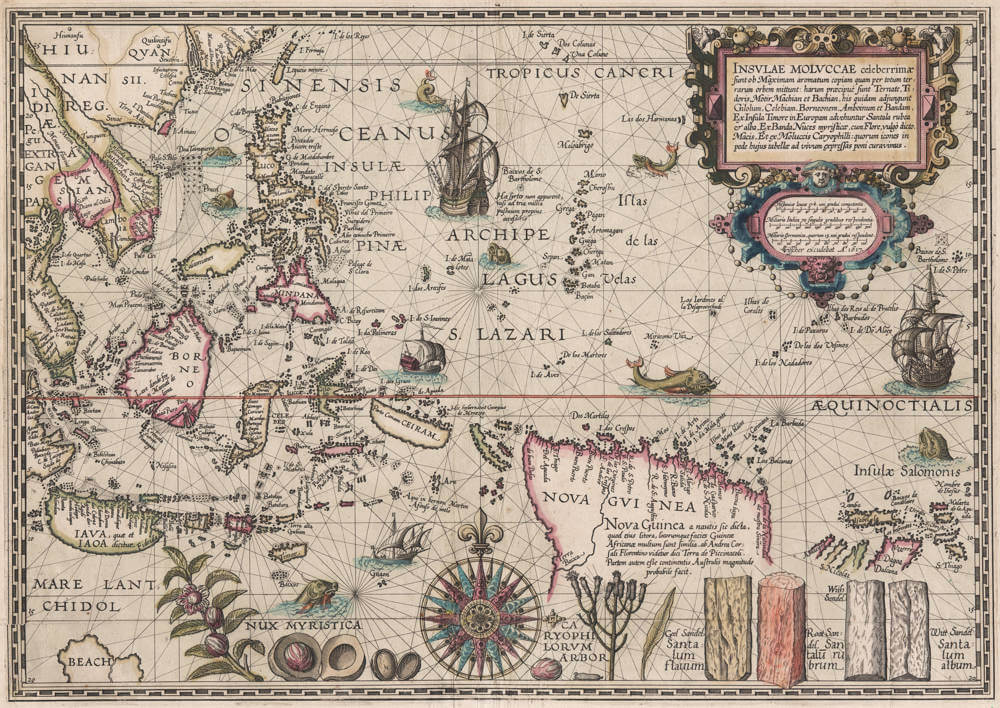 As noted in the title, running along the lower edge of the map are drawings of the most coveted products of the Moluccas: