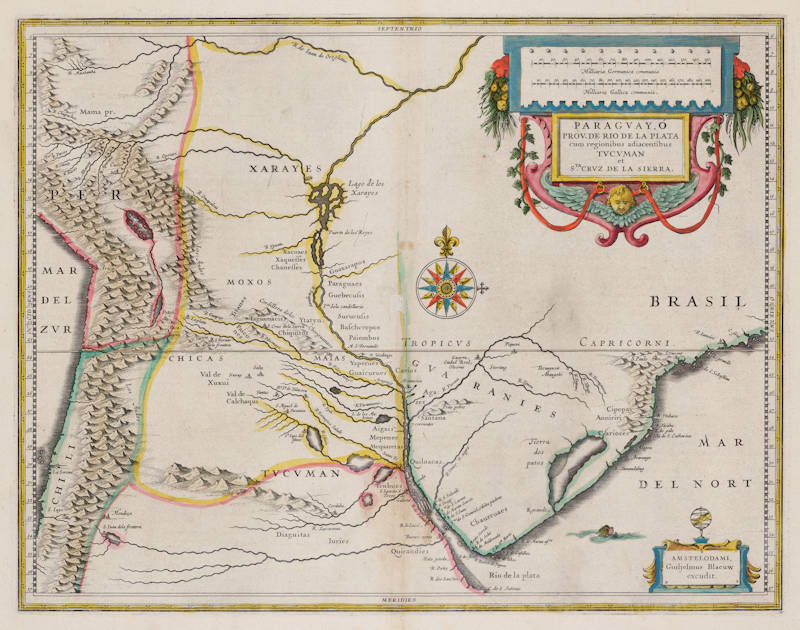 One of the plates of Jodocus Hondius aqcuired by Blaeu after Hondius' death. Decorative view covering todays Uruguay (Monte Video), Paraguay (Ascuncion) and northern Argentina (Buenes Aires). The area was famous for the Rio de Plata smuggle routes from and to Peru, to avoid the very expensive official trading route with Peru via the Panama Isthmus.