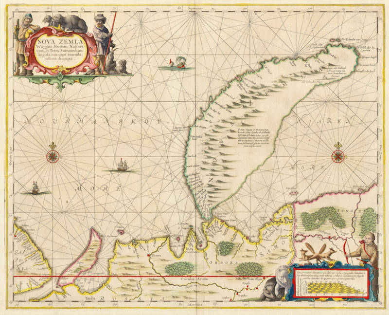 Very elegant sea chart with two spectacular cartouches, decorated with hunters, polar foxes, polar bears and wallruses. The chart is further embellished with rhumb-lines, two compass roses, two sailing ships, and a sea monster.