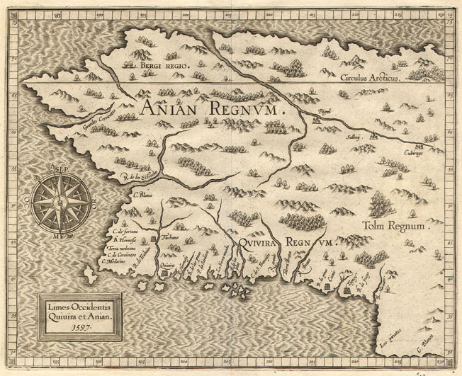 ANIAN REGNVM stems from the strait separating the continent from Asia; it was so named by Giacomo Gastaldi in 1561. There are two states of the map: