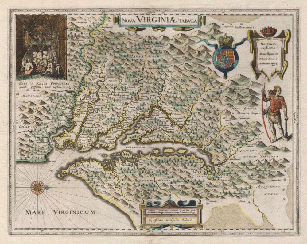 Willem Blaeu's famous landmark map of Virginia and the Chesapeake region, modeled after John Smith's map of Virginia, the most important map of Virginia published in the 17th century, and the prototype for the area for half a century.