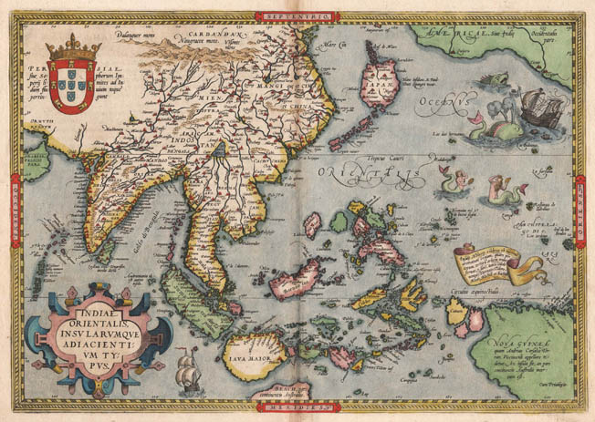 One of the most splendid maps of Ortelius, this map has everything that makes sixteenth century maps so attractive. Lovely mermaids, gruesome sea monsters and shipwrecks included. The cartography is distorted. Many elements of Marco Polo have been used, as well as the latest discoveries. Japan has the typical kite shape introduced by Mercator. The Portuguese coat of arms is shown prominently to underline that this is "Portuguese India".