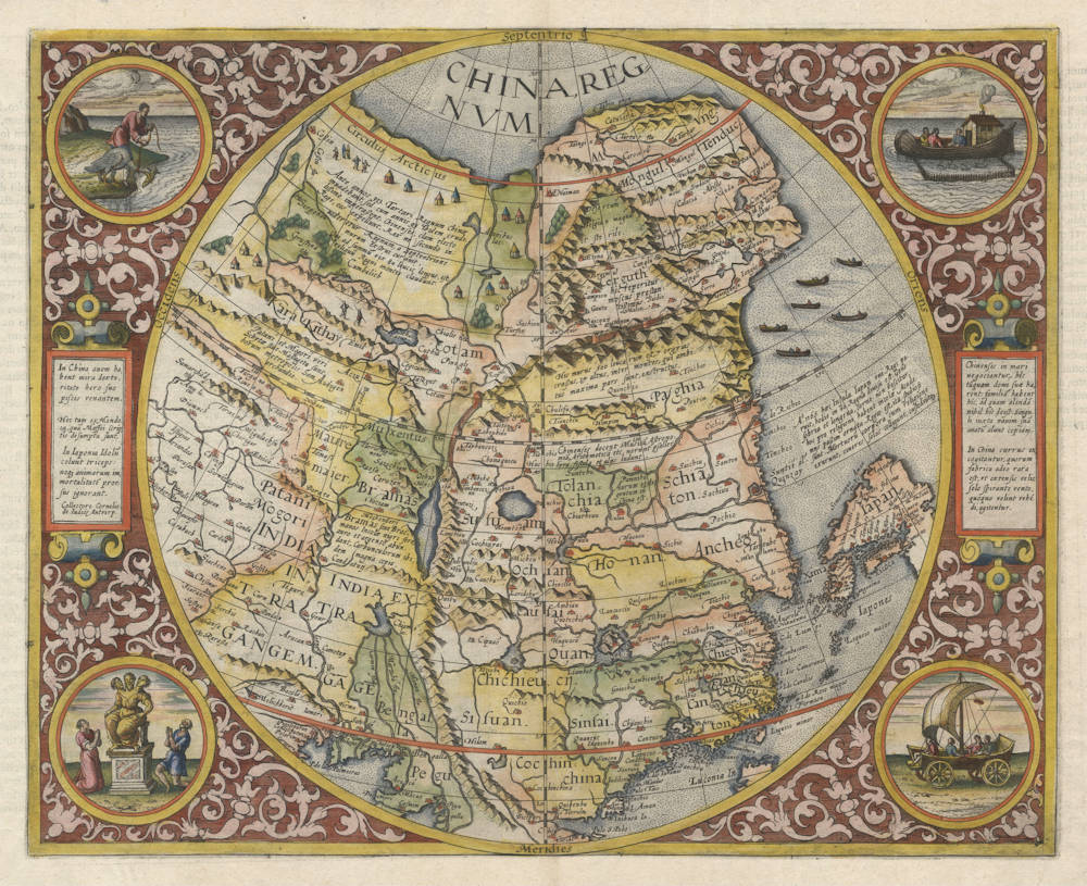 One of the rarest, most sought-after, and most decorative early maps of China. Published by Cornelius de Jode of Antwerp, 1593.