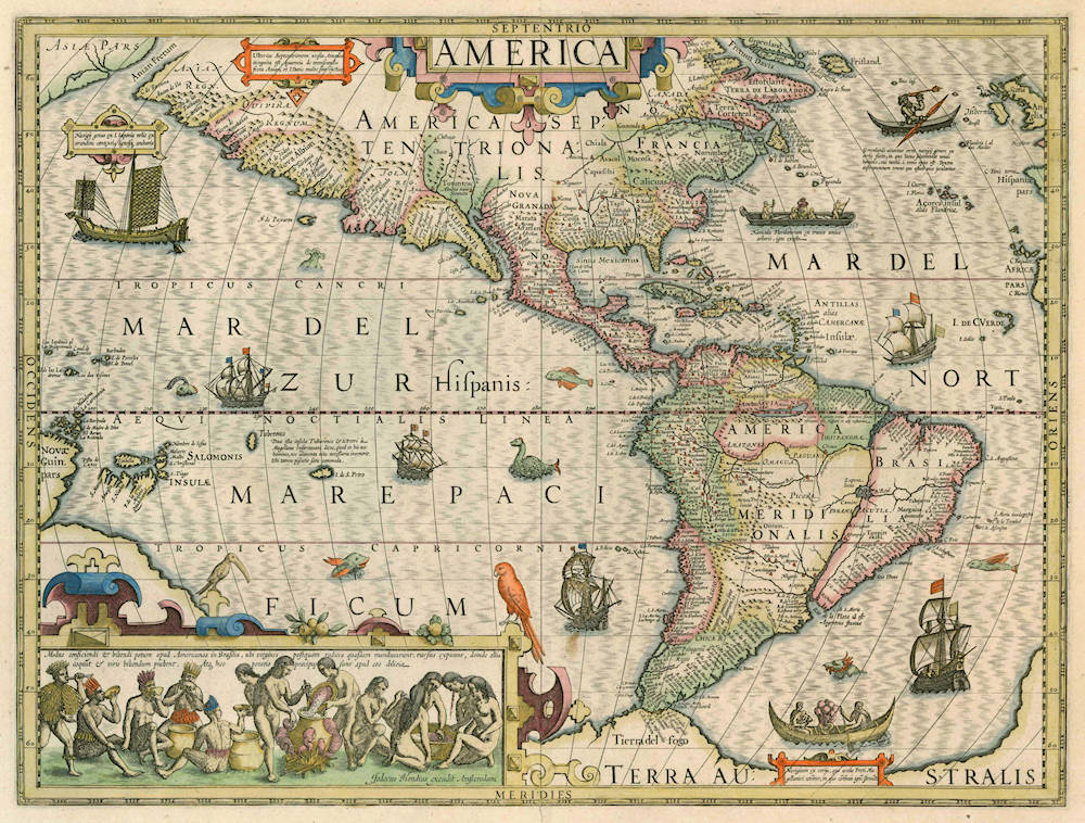 Right up until 1630 this map was issued alongside the America sive India Nova by Michael Mercator, 1595. Since the text describing America was always used by the Mercator, this one is always lacking one. Produced on a stereographic projection like more and more maps of the time, it is an amalgam of various sources. It incorporates a more correct west coast of South America and narrows still further the longitudinal width of New Spain at the Tropic of Cancer, making it just 10 degrees, much closer to reality. However, just like all cartography before, it still retains an enlarged North American continent. A Plancius type depiction of Newfoundland occurs alongside a typical period representation of the east coast, with a more protruding Virginia than usual. Various scenes taken from the earlier volumes of de Bry's 'Grand Voyages' adorn the whole. Particularly notable is the native Brazilian scene illustrating the method used to make a local beverage, derived from Hans Staden's voyage as recorded by de Bry. There are various galleons, kayaks and Indian canoes along with a pair of birds perched on the inset.