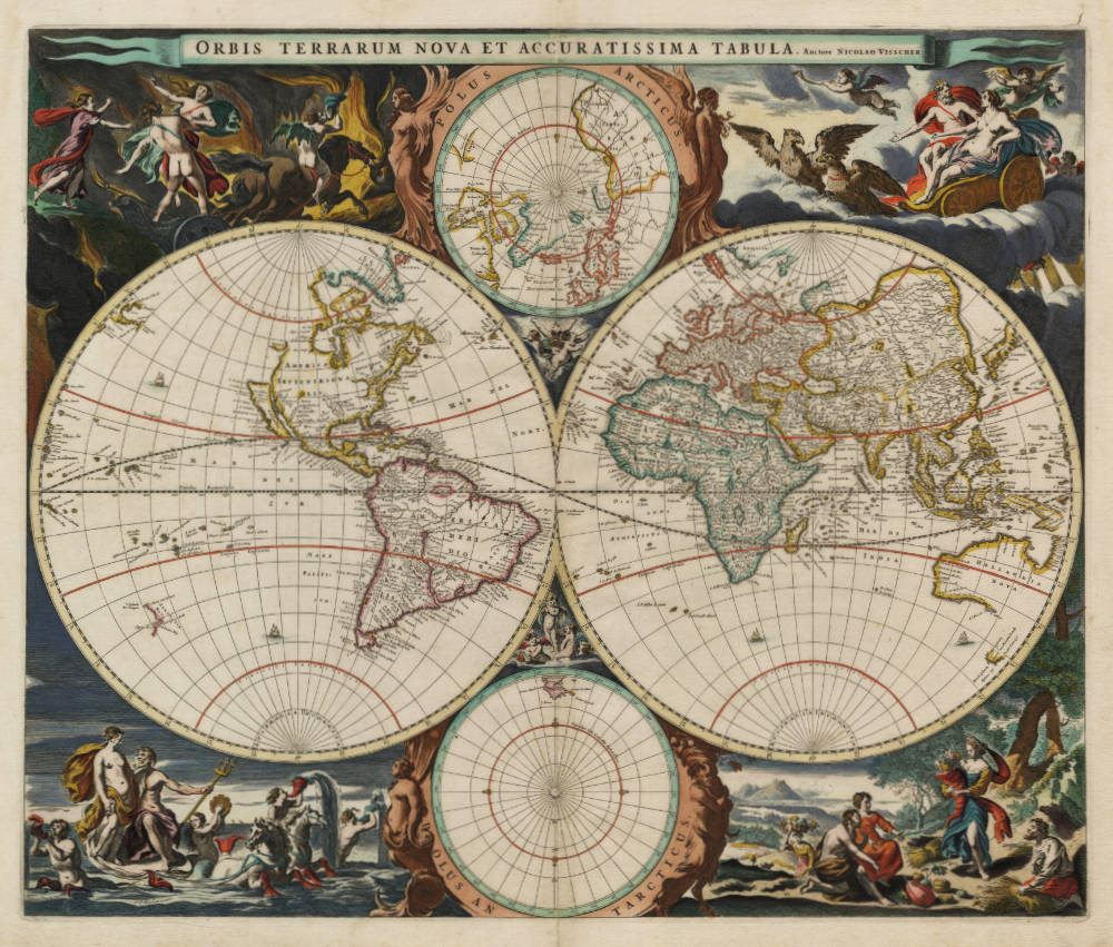 Beautiful and iconic double hemisphere map of the world, decorated with spectacular allegories of the four elements from classical antiquity, earth, air, water and fire. One of the earliest obtainable maps to show the Tasman discoveries.