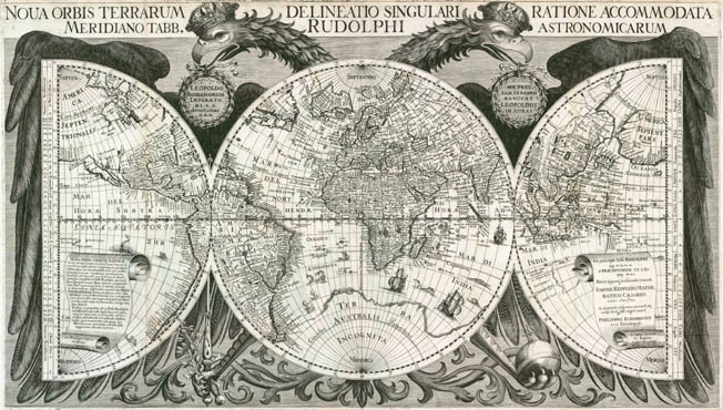 A note in the lower right-hand part of the map says that it was designed by Philip Eckebrecht of Nuremberg and engraved by J.P. Walch. The central hemisphere's prime meridian is based on the Danish astronomer Tycho Brahe's observatory in Uraniborg: the remaining parts of the world are in bifurcated form on either side. A magnificent double headed eagle embraces the continents, and the map is dedicated to the Holy Roman Emperor. The design harks back to Braun's imposing wall map of 1574 which is also headed by the Imperial double-eagle and has the continents in bifurcated form.