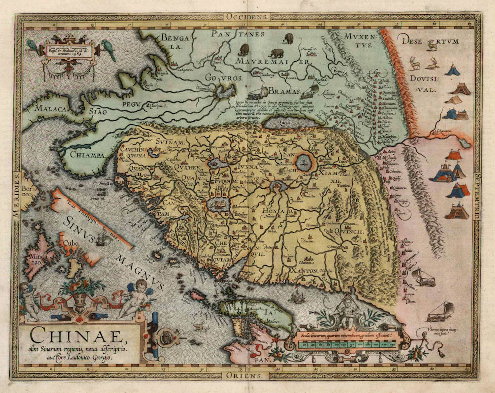A seminal map of China published by Ortelius from 1584 onwards. The map had been compiled by Luiz Jorge de Barbuda, a Portuguese Jesuit missionary. West is at the top of the map. Three decorative cartouches. Pictures of Tartarian wagon-dwellers, sailing wagons, elephants and reindeer fill the unknown areas north and east of China.
