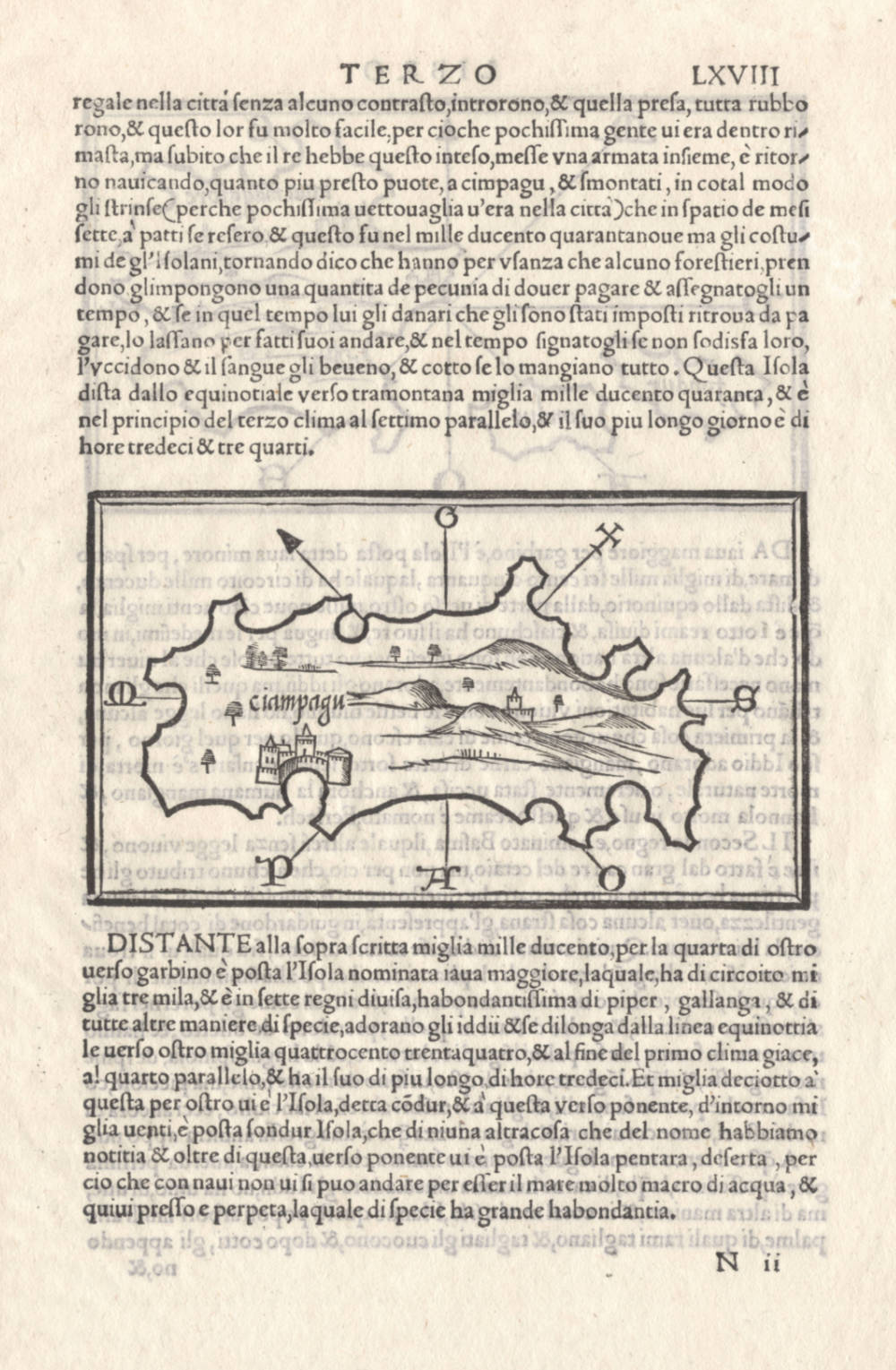 The map is oriented exactly opposite to the true orientation of the main Japanese island of Honshū, with the north-east (Greco) at the top. The compass points, reading in a clockwise direction, are (other than North, shown as an arrow point) indicated by the first letter of each of the wind names: Levante (E), Scirocco (SE), Ostro, (S), Africus (SW), Ponente (W), and Maestro (NW). The only placename on the map is ciampagu, one of the many corruptions of the Chinese jihpen-kuo or, indifferently, Cipango, Cipangu, Zipangu, Zinpangri, and so on.