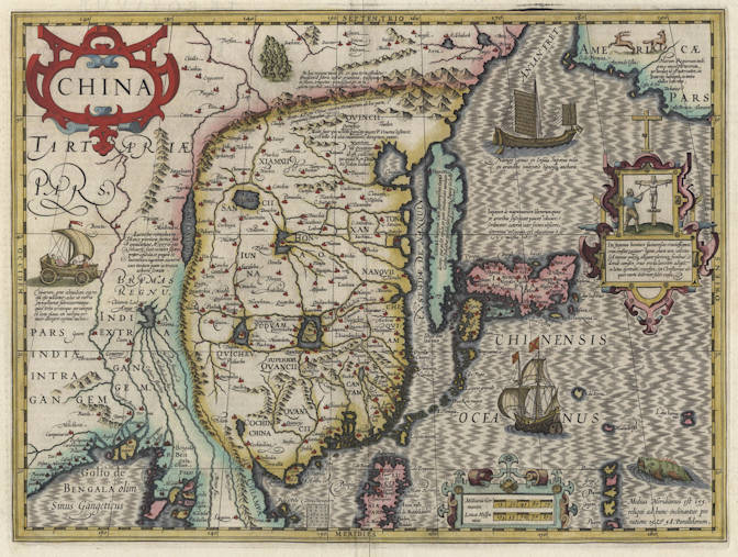 The ship north of Japan is copied from Oliver van Noort's 1602 journal of his circumnavigation. It was the first encounter of the Dutch with a Champan, and Van Noort and his crew were quite impressed. The journal reads: