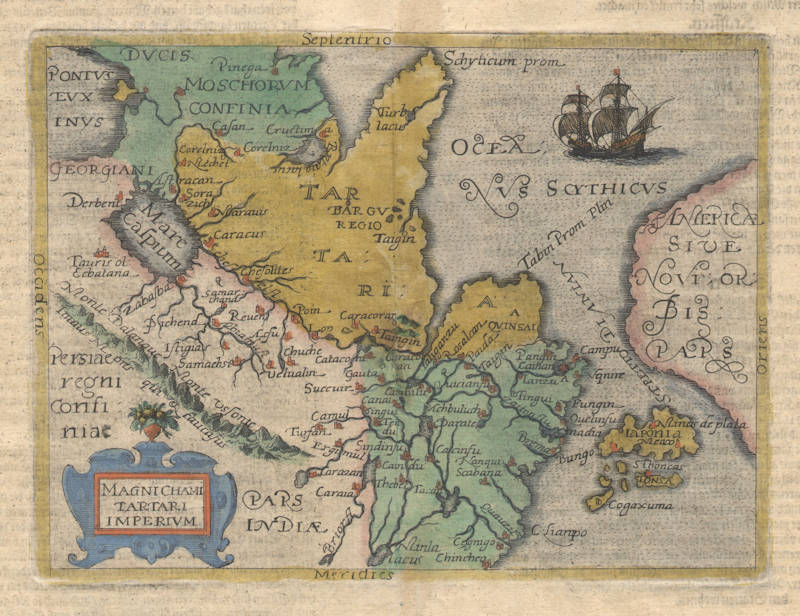 This map of Tartary is attributed to Lambert Andreas on the basis of his publication of the atlas in which it is found. This was a translation of the popular geographical work by Giovanni Botero in Rome. It displays part of the west coast of North America, which bears no placenames. A ship is prominently placed in the Arctic Ocean where none had as yet travelled, and Japan takes its usual position midway between the two continents of America and Asia. It appeared in a total of six different works which are listed below: