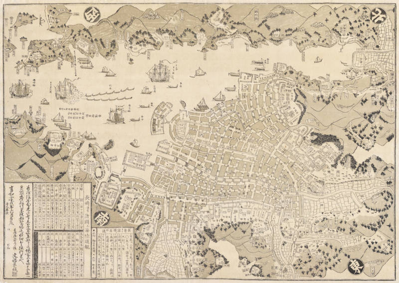 Relief shown pictorially. Oriented with north to the upper right corner. This map depicts the streets, temples, shrines, lakes and harbor of Nagasaki. In the harbor, ships from foreign countries are identified, namely ships from China and Holland. The location of the foreign colonies of Holland and China are also identified.