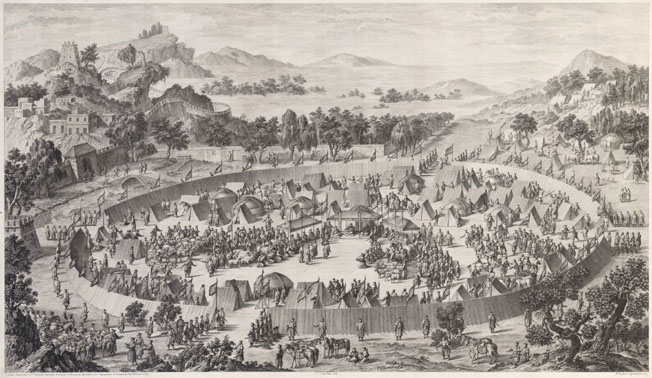 The Chief of Us (Turfan) surrenders with his city in 1759, the Tartars presenting tributes. One of a rare series of sixteen views, engraved for Qianlong in France under the supervision of C.N. Cochin, celebrating the emperor's victory over the muslims of Eastern Turkestan (Xingiang). This view records the surrender of Huo Jisi of Turfan in 1758. Large showpiece.