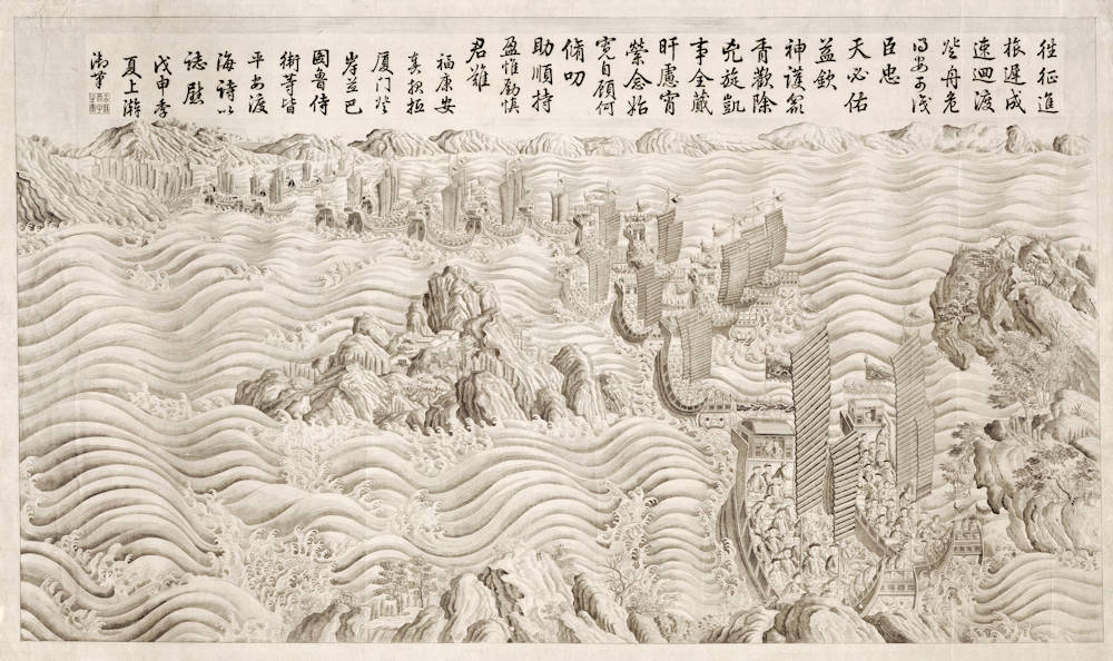 The rebellion was defeated and the army returns home in triumph. The islands depicted in the background of the print is Taiwan, the formation of rocks on the left side is the Penghu Islands. The land on the right is Chinese soil.