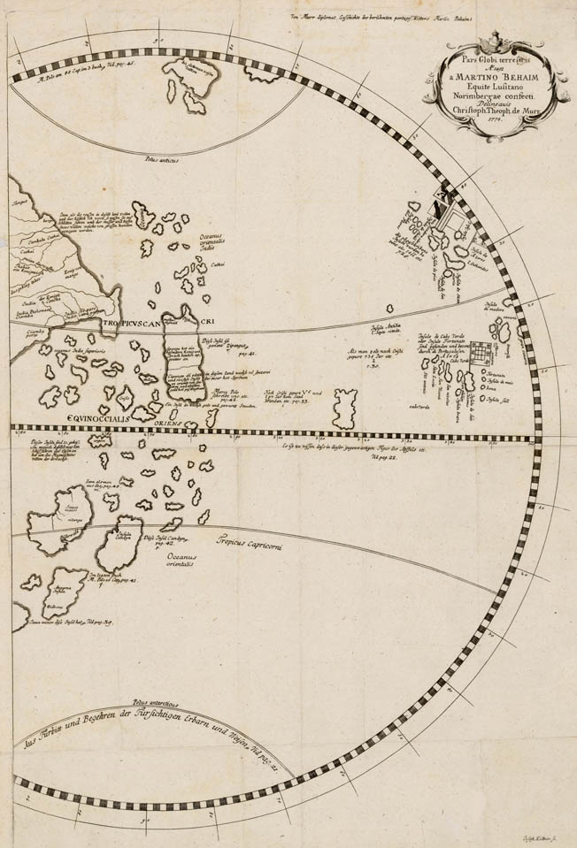 Rare and fascinating map of the Indian Ocean and Pacific taken from Martin Behaim's 1492 Erdapfel, the earliest surviving terrestial globe.