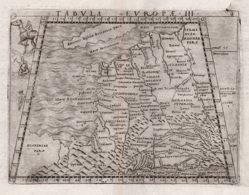 Ptolemy's third map of Europe by Giacomo Gastaldi, covering France. Gallic warriors are depicted in the left border.