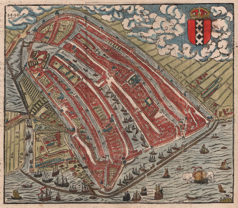 The oldest printed map that is available of Amsterdam. This map served as the prototype for Braun & Hogenberg's 1572 map of the city. Set in a page of text.