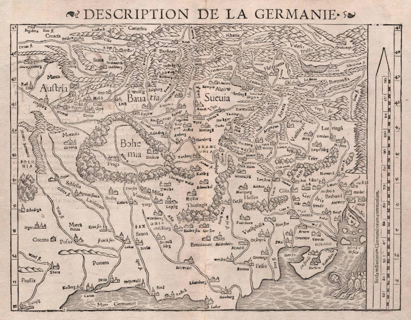An eminent German mathematician and linguist, Münster became Professor of Hebrew at Heidelberg and later at Basle, where he settled in 1529. In 1528, following his first mapping of Germany, he appealed to German scholars to send him "descriptions, so that all Germany with its villages, towns, trades, etc. may be seen as in a mirror", even going so far as to give instructions on how they should "map" their own localities. The response was far greater than expected and such information was sent by foreigners as well as Germans so that, eventually, he was able to include many up-to-date, if not very accurate, maps in his atlases.