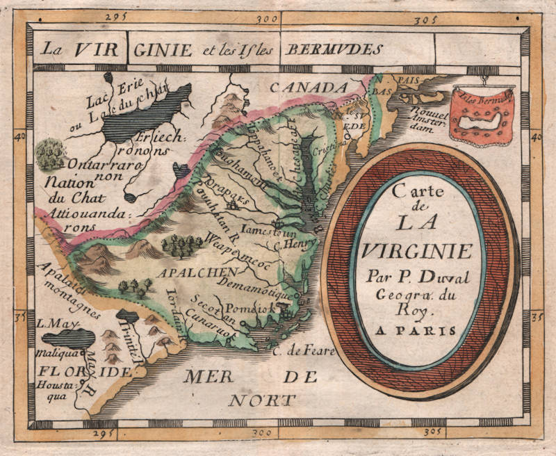 The title is altered to Carte de LA VIRGINIE Par P.Duval Geogra, du Rov A PARIS. There is much new nomenclature including Nouuel Amster=dam and Lac Erie