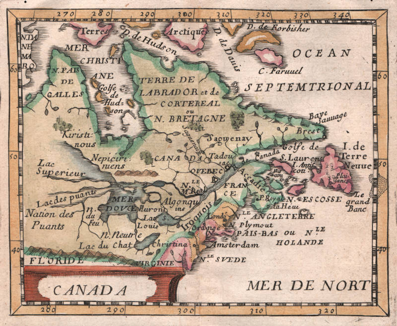 This is one of a number of North American related maps in Pierre Duval's modest Le Monde Terrestre. It is derived from his uncle, Nicolas Sanson’s, Le Canada, 1656. Even including the familiar sea route through the north-west of Hudson Bay. The author has identified four states of the map. There is a later derivative published in Nuremberg, 1678, by Beer: