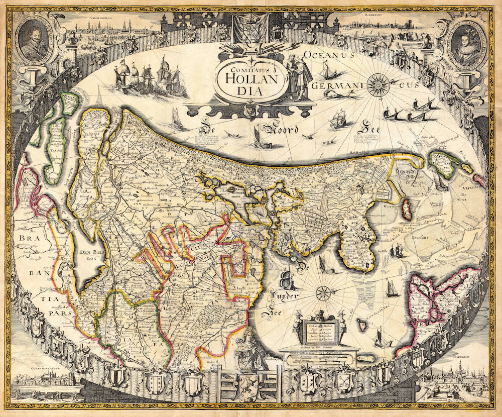 The map maker presents this map of Holland in a special way: the map image is bordered by an oval fence of wattle-work, representing the so-called 'Holland in de tuin' ['Holland in the Garden']. The 'garden' is closed at the front by a gate which is decorated by the coat of arms of Holland (the lion, however, is in mirror image). Behind the gate the Maid of Holland keeps watch. On the posts of the fence hang the coats of arms of Holland's towns. In the top corners are oval wrought-iron medallions with the portraits of Frederik Hendrik, Prince of Orange (to the left) and his wife Amalia van Solms (to the right). Towards the centre are views of AMSTELREDAM and DORDRECHT, the bottom corners are occupied by views of the CURIA HOLLANDIÆ (to the left) and HAERLEM. This is the first time that town views on maps of Holland are not shown in oval or rectangular frames. In this way the etcher created a much better spatial effect. Three of the four town views (all except Amsterdam) are based on those engraved by Pieter van den Keere for Guicciardini's Description de touts les Pays-Bas (Arnhem, 1613).