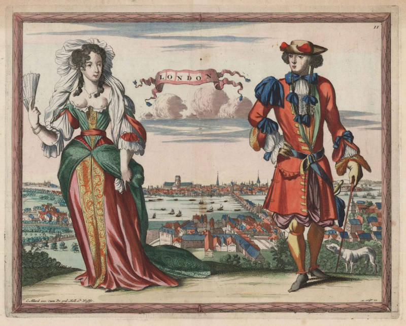 Exceptionally rare costume view of the city of London, from Carel Allard's unobtainable Orbis habitabilis Oppida et Vestitus (The Towns and Costumes of the Inhabited World), the rarest of all town books. In stunning original color.
