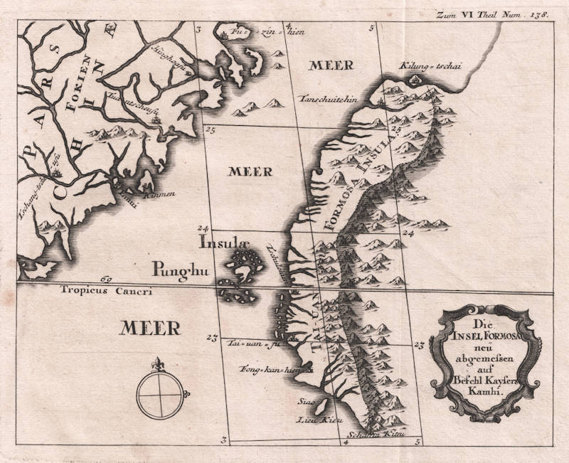 Stöcklein's work is a compound of letters of the Jesuit missionaries from all over the world and here particularly the ones stationed at the court of the Emperor Kamhi. This Emperor ordered the priests known by their names as Pater (Father) Regis, Hinderer and de Mailla to carry out a survey of his empire including his territories on the island of Formosa.