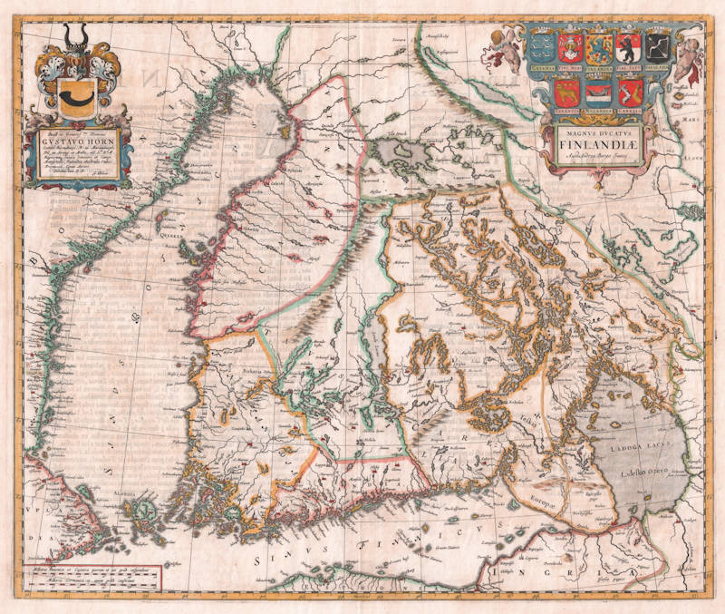 Blaeu's title piece incorporates the arms of the provinces of the Grand Duchy: 'Caiania' [Oulu and Vaasa] 'Finlandia' [Turku and Pori], 'Finlandia Septentrionalis' [Lappi] 'Savolaxia' [Kuopio and Mikkeli], 'Tavastia' [Häme], 'Nylandia' [Uusimaa], and 'Carelia' [Karjala]. In the opposite corner, Blaeu gives a dedication to Gustav Horn (1592-1657) of Björnebor [Pori], who was governor of the south-eastern regions of Kexholm and Ingermanland, giving a date of origin of Blaeu's map between 1651 (when Horn was made a Count) and 1657 (the year of his death). The arms of Finland were also relatively recent in origin, being first used in the 1580s.