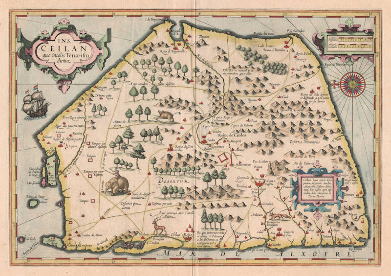 Jodocus Hondius' superb map of the island of Ceylon, first issued in the 1606 Mercator-Hondius series of atlases. As mentioned in the lower right cartouche, the map was designed by Petrus Plancius. The toponyms leave no doubt that the map is based on Portuguese sources. North is to the left of the map.