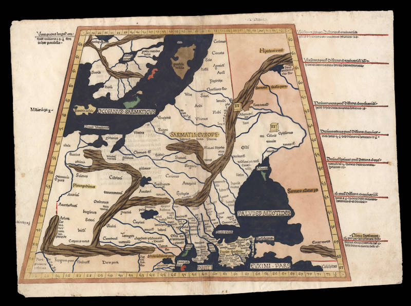 Nicolaus Germanus' spectacular version of Ptolemy's eight map of Europe, covering today's Russia, Ukraine, Eastern Europe and Scandinavia. Very rare.