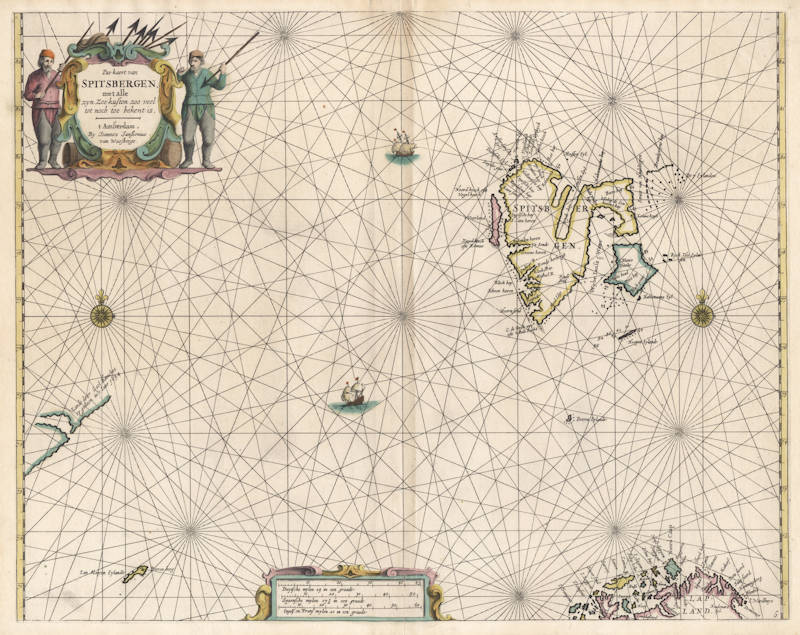Johannes van Loon's very rare sea chart of Spitsbergen, where the Norwegians, the English, the Russians and the Dutch had a whaling station. The chart also includes the North Cape and Jan Mayen.