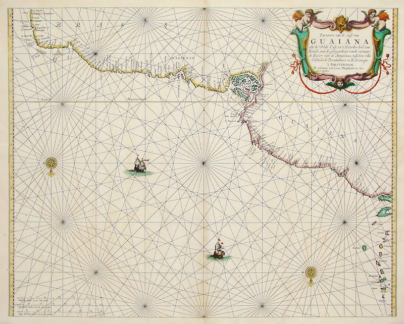 Johannes van Loon's very rare sea chart of the "wild coast" of the mythical Guyanas, with the northeastern coasts of Brazil and including Trinidad and the Leaser Antilles. The chart covers the coasts from Olinda/Pernambuco to Trinidad, including the estuaries of the Amazon and Orinoco rivers. The Lesser Antilles show Tobago, Granada, Barbados, Saint Vincent, Santa Lucia, Martinique, Dominica, Guadeloupe, Antigua and Barbuda.