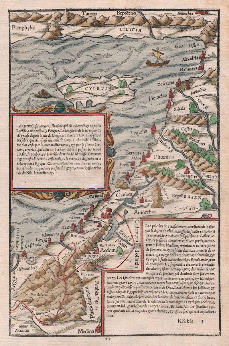 Sebastian Münster's single-page map of the Holy Land, Syria and Cyprus. With two cartouches.