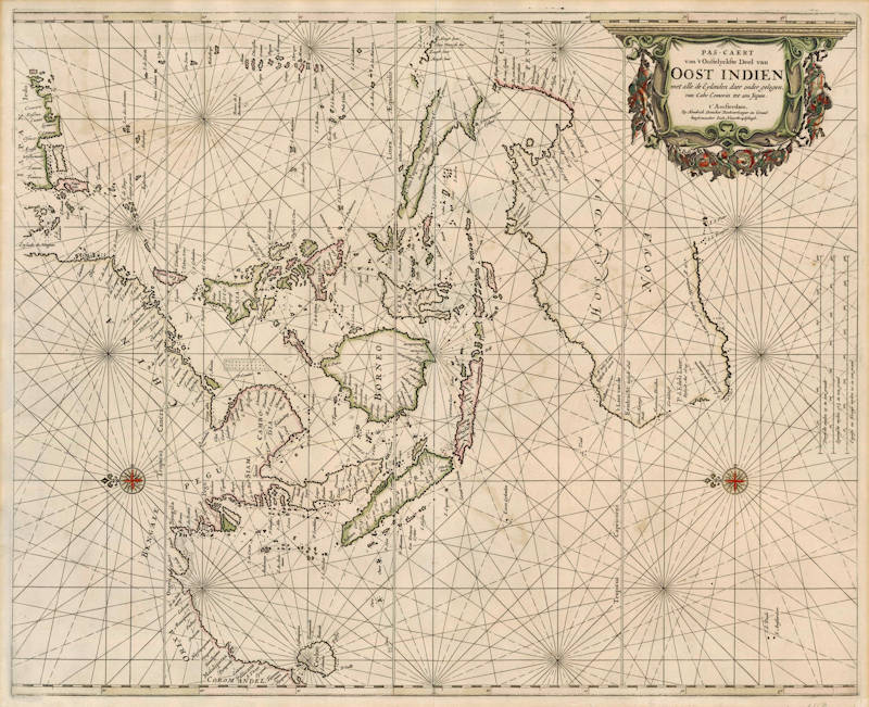 One of the rarest of all Dutch sea charts of the Far East and Australia. A classical Dutch sea chart inspired by the 1661 van Loon sea chart of the same area. Thick paper, stunning original colour.