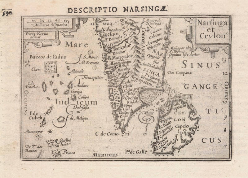 A milestone map for the region. The geographical content is largely derived from the 1596 Linschoten map of the Middle East and India.