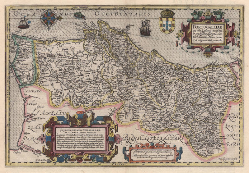 Decorative map of Portugal after Alvaro Secco. Beautifully engraved by Baptista van Doetecum with compass rose, ships, sea monsters and strapwork cartouches.