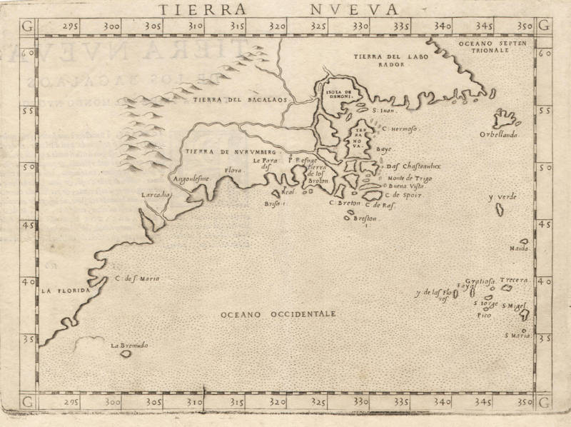 When Verrazano scouted the East Coast of North America, he cautiously headed out to sea after Narragansett Bay to avoid treacherous shoals, but in doing so missed Cape Cod and much of the New England coast. Cartier, on the other hand, did not venture further south than Cape Breton. As a result, Gastaldi grafts eastern Canada onto southern New England, with Cape Breton Island sprouting directly from Narragansett Bay. Mercifully, Gastaldi ignores Verrazano's famous Outer Banks "isthmus" report and spares the coast the distortion that arose therefrom; unfortunately, though, he does not incorporate data from Cartier's exploration of the St. Lawrence on his second voyage.