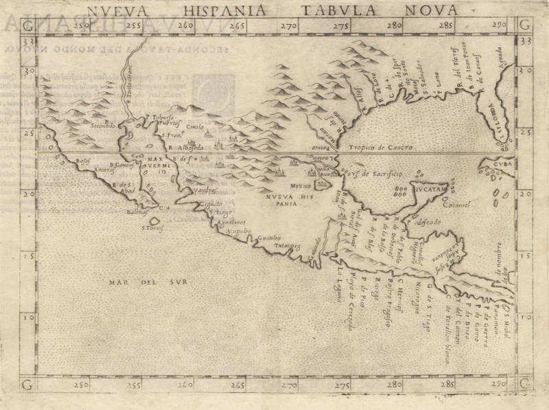 This map of New Spain is an enlarged version of Giacomo Gastaldi's published in 1548. The nomenclature is similar and cartographically it is identical with the noticeable exception of the Yucatan which is now shown correctly as a peninsula. There are clear signs, however, that the engraver first cut the plate to show an island, and his error was not completely erased when corrected. No example has been found in its insular form.