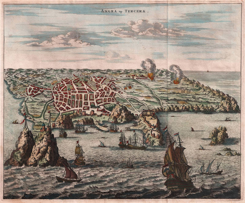 "This beautiful engraving of Angra on Terceira depicts the city and its surrounds under attack by sea. Ships menace the harbor, and fires can be seen springing up in the fields beyond the city walls. The Portuguese stronghold on this key Atlantic port of call came under fire more than once in its history, and it is not clear which attack this particular view depicts.