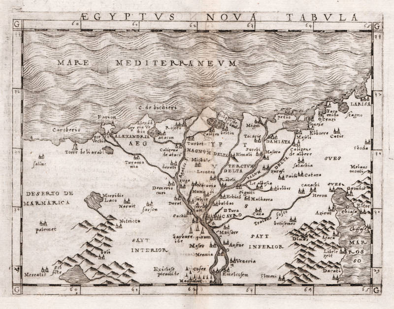 Giacomo Gastaldi's new map of Egypt, the first modern map of the region. The three great pyramids are depicted west of Cairo. A cornerstone piece.