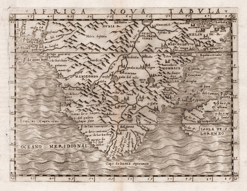 "The sea engraved in wavy lines, the town shown in minute vignettes. Title in Roman capitals above top border of the map. Depicts several rivers, Nile, Cuama (unnamed), Spiritu Sancto and Infante. Numerous mountain ranges including the Mountains of the Moon, and the towns of Hamarich, Melinda, Mombaca, Mocabique, Cefala, Garma and Damot."
