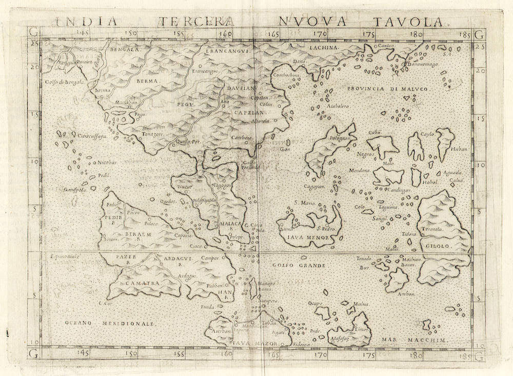 Highly distorted and inaccurate map by Girolamo Ruscelli after Jacopo Gastaldi's 1548 miniature map of this region. A cornerstone map of the area that introduces new knowledge from the Portuguese explorations.