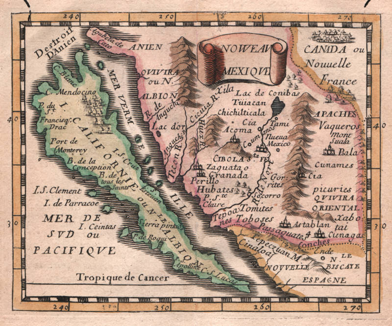 Duval's very rare map of New Mexico, with Californiua as an island and the American southwest. The map shows many mythical places, including the legendary Strait of Anian and the Cities of Cibola, as well as Francis Drakes's landing place and New Albion. "Canada or New France" in the upper right. State 2 of 4.