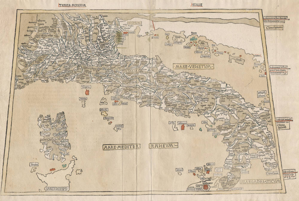 This map of Italy, with its chocolate-colored mountain ranges running through the Italian peninsula, along the Alpine borders, and through Dalmatia, is one of the tabulæ novæ or ‘new maps' which were added to editions of Ptolemy's Geographia in the late 15th century. It comes from an edition published in Ulm in 1482 which was prepared by Dominus Nicolaus Germanus, a Benedictine monk from Saxony.