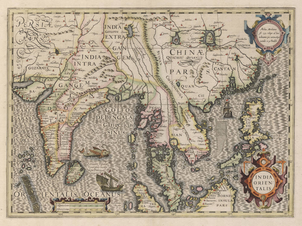 As a youth, Hondius showed a talent for drawing and calligraphy, and later developed a fine reputation as an engraver. He also studied mathematics, Greek,and Latin, and the Lutheran faith. The Duke of Parma offered Jodocus the opportunity to continue his studies in Rome, but he declined the offer, probably to avoid religious conflict. Ironically, the Duke of Parma subsequently captured Ghent, where Hondius was living, and many Protestants were forced to flee, Jodocus among them. He resettled in England, where he carried on as an engraver and instrument-maker, as well as a maker of maps and portraits. He returned to the Continent in 1593 and set up shop in Amsterdam. Here he was successful as a maker of large wall maps and of globes, for which he had obtained, in 1597, the privilege from the Staten Generaal. In 1604 he acquired the copperplates from the Mercator Atlas, which he began publishing two years later, supplemented by his own, more up-to-date, maps. Two of his new contributions covered Southeast Asia: this map focusing on the mainland, and one devoted to the islands."