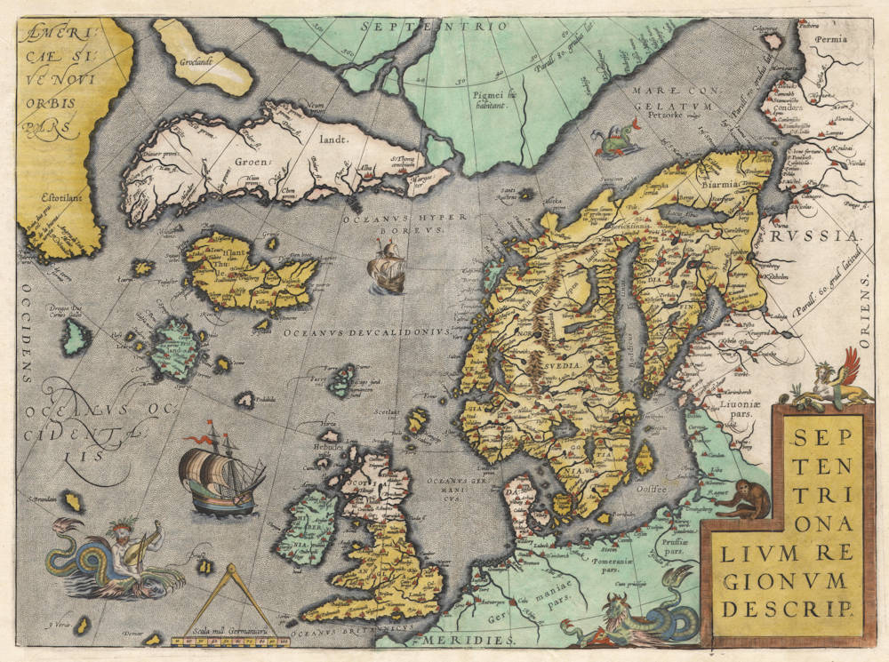 Myths and legends: Ortelius' rendering of Scandinavia and the North Atlantic based on Olaus Magnus 1539 map, Zeno's 1558 map and on Mercator's 1569 wall map of the world.