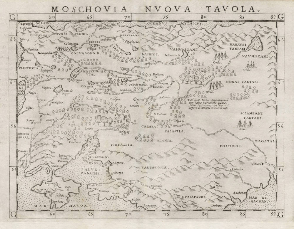Girolamo Ruscelli (1504 Viterbo -1566 Venice), an Italian Alchemist, Physician and cartographer, was editor of a revised and expanded Italian edition of Ptolemy's 'Geographia', published as 'La Geografia di Claudio Tolomeo. The newly engraved maps were based, generally, on those compiled by Giacomo Gastaldi for the Venice miniature atlas edition of 1548.