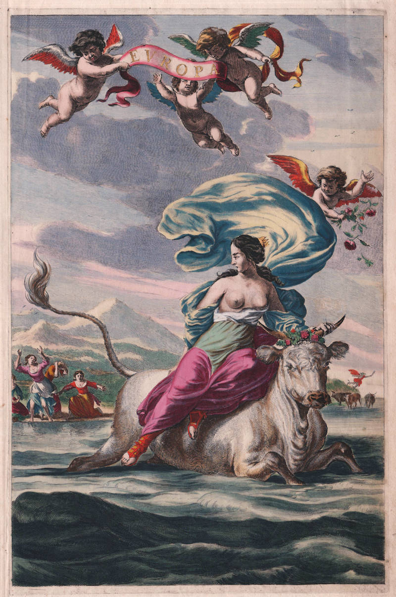 Allegorical representation of Europe. The continent is depicted as Europa, the daughter of the King Agenor of Sidon. When she and here companions were off gathering flowers by the sea, Zeus noticed this charming group, particularly Europa, and appeared to them as a white bull. Europe slid on to the bulls back and the bull charged off, plunging into the sea, and began to swim rapidly from the shore. This scene is depicted here. In the sky three putti with a banderol inscribed “EVROPA.” This plate is engraved by Johannes Visscher.
