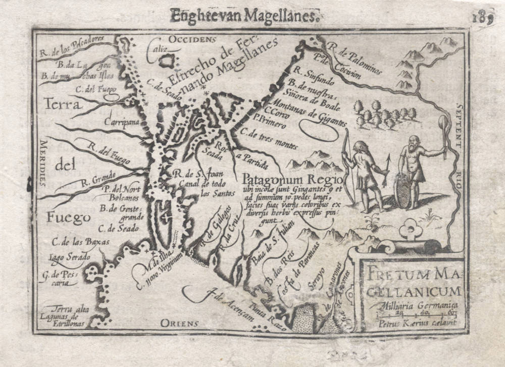 Giant Patagonians are shown, which are said to be between 9 and 10 feet tall, as first reported by Magellan's circumnavigation of the world. Most toponyms can be traced back to Magellan, although the origin of many toponyms on the mysterious South Land is not clear.