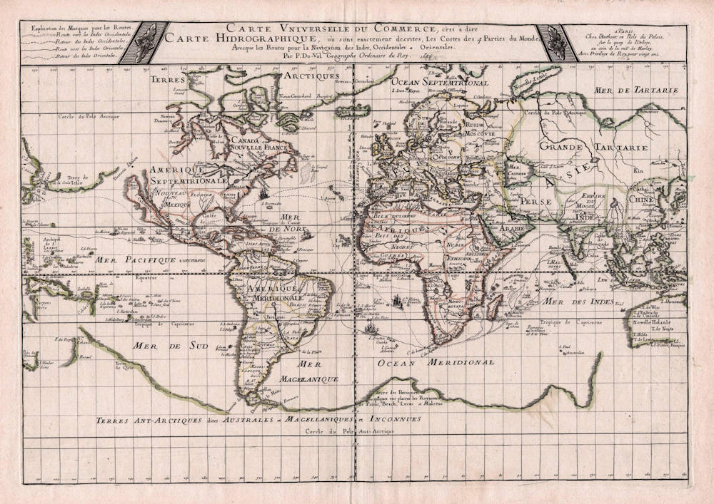 "This plane projection of the world by Pierre du Val shows the principal trading routes across the oceans, particularly those to and from the East and West Indies.